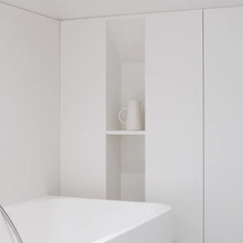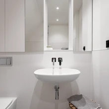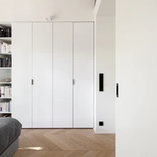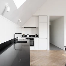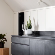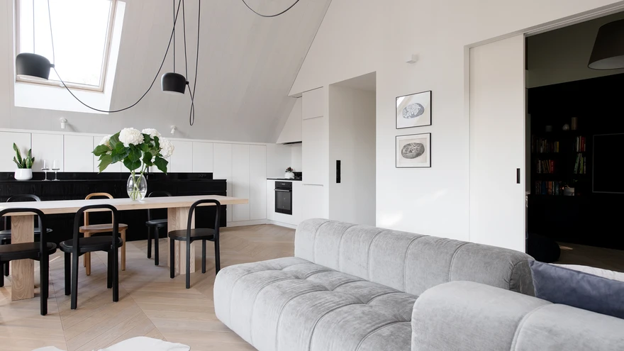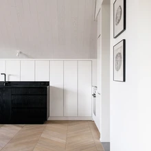 Visuaalse karskuse üheks saladuseks on tegelikkuses ka arvukas hulk sisseehitatud kappe ja panipaiku, mis esmalt üldse silma ei torka. Sisearhitekt on nimelt kavalalt ära kasutanud viilu alla jäävaid mahte, mis muidu otstarbetult seisma jääks. Päris katuse alla, magamistoa vannitoa otsa ja kabineti kapi kohale on loodud eraldatud tasapinnad, kus saavad vajadusel ennast magama sättida külalised või kuhu võib tekkida hoopis lisapaik mänguks või asjade paigutamiseks. Katusekalle ja nurgad toovad omakorda sisse muidu neutraalsust taotlevasse ruumi huvitavat geomeetriat.