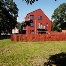 2017. aastal projekteeritud ja 2019. aastal valminud hoone arhitektid on Tõnu Laigu, Ljudmilla Georgijeva ja Koit Ojaliiv. Laigu QP Arhitektid on tuntud kindlakäelise kavandamise poolest, kus püüdluste keskmes on terviklik ja esteetiliselt korrastatud ruum. Punane maja on kaheldamatult piirkonna uute ehitiste seas üks silmapaistvamaid: julge, nüüdisaegne, aga samas ikka vanast lugu pidav. Pelgulinnas on iga uue maja ehitamine olnud sündmus ja antud hoone tekitas furoori oma viisiga, kuidas täitsa teistmoodi saab tõlgendada traditsioonilisi lahendusi, nagu puidune fassaad, kõrge katus.