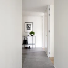 Kodus on suurilmalikku elegantsi. Meelde jäävad väärt materjalid, soliidne viimistlus ja läbimõeldud detailid. Näiteks uksed on maast laeni, mis oli korrektse teostuse mõttes paras peavalu. Esiku ja vannitubade keraamilised plaadid annavad edasi urbanistlikku betoonilikkust, tubades on aga palja jala all soe tamm. Seinad on valged ja valge on ka osati kaldlae pinda kattev parkett.