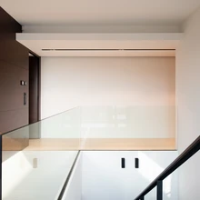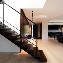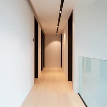 Maja avatud alumiselt korruselt, kus paiknevad kabinet, saunakompleks ja veranda, viib teisele korrusele pilku püüdev trepp, mis mõjub selles interjööris skulptuurse objektina. Teisel korrusel on halli seinas puitpaneelid, sama tooni on ka ruumide kõrged (2,4 m) uksed, mis loovad vahva rütmi valgeks värvitud koridori seintega. Samuti loovad majja projekteeritud läbimõeldud valguslahendused (karniisi-ja süvistatud laevalgustid) meeleolukaid ruumimuljeid.