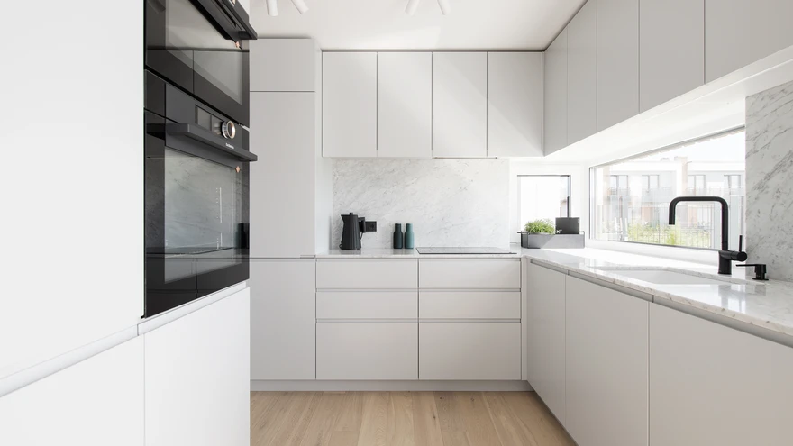 Kööki ilmestavad kordumatu mustriga Bianco Carrara marmor ja erilahendusega mööbel. | foto: Terje UgandiSisearhitekt Johanna-Lisete Alling on kavandanud Järveküla ridaelamusse stiilse minimalistliku interjööri, mida ilmestavad looduslikud materjalid, eritellimusmööbel ja sisekujundusega ülihästi sobituvad aksessuaarid.