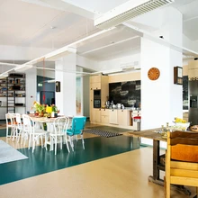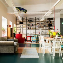 Vineerist köök lasti valmistada sõprade puidutöökojas ning kappinuppudeks kasutati ära sahtlis seisnud vanad erivärvilised nahanäidised. Metallist raamaturiiul pärineb ühe vana kohviku inventari hulgast ning see ootas aastaid oma uut funktsiooni. Suurde ruumi aitavad kodusust tuua humoorikad detailid – kuskil on laetalade all surfilaud, toekale postile on naelutatud suusad ning diivanite kohal ripub roheline helendav väljapääsutähis.