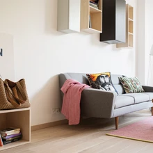 Kuna see on rendipind, ei sekkutud korteri planeeringusse, paika jäi ka põrandate, seinte ning tualettruumide viimistlus. Sisearhitekti kavandite järgi valmis magamistoas eraldi seinaosa taha jääv tammespoonist garderoobisisustus, seina- ja põrandariiulid ning köögimööbel. Köögisisustus on valmistatud kergest vineerist ning see haakub helge ja noortepärase ruumiideega. Samuti peab väike ruum olema paindlik ja funktsionaalne ning seetõttu kavandas Elina Freimuth köögisaare nutikalt mobiilsena. Riiulite ja suure tööpinnaga köögisaar on ratastel ning seda saab vajadusel ruumis ringi paigutada. Vineerist on tehtud ka seinariiulid, madal aknaalune riiul-pink ning esikugarderoobi sisustus. Eritellimusmööbli valmistas Magnar Freimuth Freims Studiost. Lükanduste asemel varjavad panipaika kvaliteetsest hallist kangast kardinad. Tekstiili kasutamine garderoobiriiulite ees on praktiline ja kena, seda iseäranis väikeses kodus või rendipinnal, kus tuleb mõelda ratsionaalsetele lahendustele.