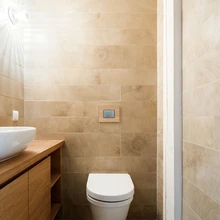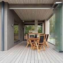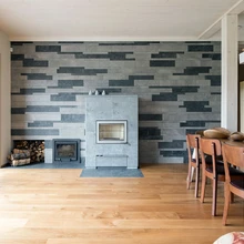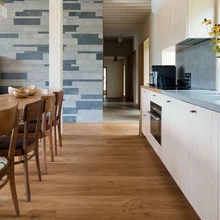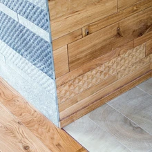 Puitmööbel pole Eesti kodudes midagi ebatavalist, kuid siin on tõesti peaaegu kõik puidust. Ühte koridori seina katavad unikaalsed puitplaadid, mis laenavad oma mustri elutoa seinas puidule vaheldust pakkuvatelt keraamilistelt plaatidelt. Kus pole olnud võimalik puitu kasutada, on vihje puidule siiski olemas – näiteks tualeti seinas olevatel keraamilistel plaatidel.