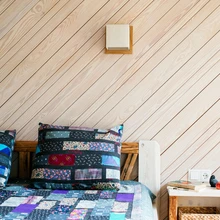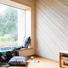 Materjalina toetab puit puhkust ja tervislikku elukeskkonda ning oli puidu võimalusterohkust korduvalt demonstreerinud arhitekti jaoks tegelikult ainumõeldav materjalivalik. Maja välimus pole petlik – see on ka seest nii puidune, nagu väljast paistab. Sisse astudes avaneb elutuba, mille ühes seinas on ennast sisse seadnud tubane köök. Suured aknad avanevad päikese poole ja aknalauad on tehtud sellise laiuse ning kõrgusega, et need pakuks lisaistekohti ja võimalust kas või tundide kaupa mugavalt aknalaual pikutades väljas toimuvat jälgida.