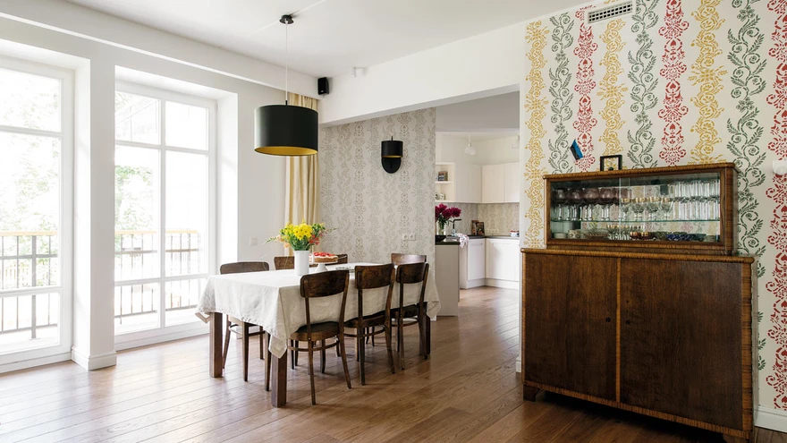 Nii söögilaua toolid kui ka puhvetkapp on korteri peremehe vanavanemate kodust pärit. | foto: Terje UgandiKadriorus Poska tänaval mõne aasta eest valminud maja ehitusaasta tekitab alailma küsimusi – see näeb välja, nagu oleks pärit Kadrioru kuldajast. Sisekujundaja Elina Freimuthi appi palunud pere tahtis endale kodu, mis oleks majaga ühes vaimus, piirkonna elegantsi ja väärikust kandev, samas uus, kerge ja avar.