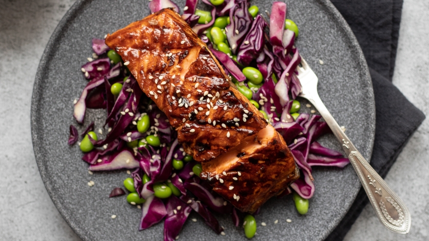 4. Grilli kala mõlemalt poolt, kuni fileede pealispind on jumekas ja kala keskelt küps. Serveeri kala ülejäänud kastme ja salatiga, puista peale seesamiseemneid.