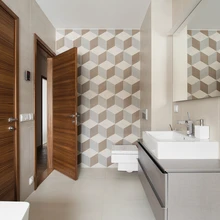 Vannituba, kuhu pääseb nii magamistoast kui ka esikust, on üllatavalt avar. Avarustunnet lisab suur aken ja konkreetse joonega vannitoasisustus. Ühele seinale on toodud särtsu ja mustrit toreda geomeetrilise plaadiga. Vannitoast viib uks sauna, mis on samuti aknaga ega jää oma ruumikuselt vannitoale alla.