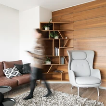 Kuna sisekujundaja Kadri Sirk kaasati projekti varakult – veel maja ehitus- ja viimistlustööde käigus –, õnnestus korteri plaani-lahenduses üht-teist muuta. Elutuppa täielikult avatud kööki ei soovitud ning Kadri kavandas kahte ruumitsooni eraldama seinaploki, mis köögi pool peidab endas riiuleid ja külmikut ning elutoapoolel sahtleid. Sarnane ruumieraldaja-vaheseina motiiv kordub ka magamistoas, tõmmates piiri toa ja poolavatud garderoobi vahele.