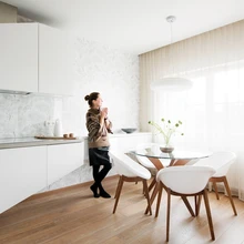 Kööki tavapärast lahendust ei tahetud ning seetõttu kinnitati eritööna valminud köögimööbel osaliselt seinale, põrandast lahti. Töötasapind on valmistatud betoonist. | foto: Terje UgandiNoor korteriomanik, kes kutsus sisearhitekt Kadri Sirgi endale appi oma uut kodu kujundama, soovis funktsionaalset, rahulikku ja maheda värvipaletiga interjööri. Kujundajale peremehe mõttelaad sobis ja hea koostöö tulemuseks on maitsekas, detailideni läbimõeldud ning terviklik kodu.