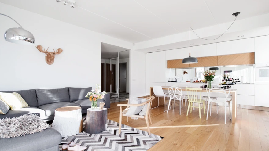 Reet Helisabeth alustas kodu kujundamist neutraalse fooni loomisega, kasutades selleks suuri pindu ja sisseehitatud mööblit. Põrandat kattev tammeparkett oli korteris varem olemas ning see sai inspiratsiooniks diagonaalspooni kasutamiseks söögilaual ja köögikappidel. Neutraalsele foonile lisati juurde efektseid detaile. Korteris annavad aktsenti geomeetrilised mustrid, peegelpinnad ja pehme värvigamma.