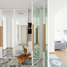 Kui tavaliselt on esik pigem väike ruum ja vaheala, siis selles korteris võib seda julgelt nimetada üheks isikupärasemaks ruumiks. Geomeetrilise mustriga põrandaplaadid on pärit Itaalia ettevõtte Refin kollektsioonist ning on valminud koostöös graafilise disaini bürooga FM Milan. Põrandaplaatide mustri järgi telliti ka vinüültapeet magamistoa garderoobi. Esiku peegelustega garderoobi on sisearhitekti jooniste järgi valmistanud DSK Mööbel ning see mahutab peale riiete ka pesumasina ja ventilatsiooniseadmed.