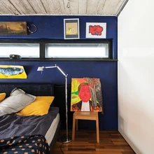 Maalid, joonistused ja fotod on samuti valdavalt kunstnikest sõprade ja tuttavate looming, lisaks töid andekatelt, ent veel vähe tuntud maalikunstnikelt, nagu näiteks Meiu Münt või Alar Tuul. Magamistuba on olnud aga ise nagu lõuend, millele on julgelt värve kantud. See on muinasjutumaa, kus sügava mere värvi seinal ujub Marju Bormeistri kala, kollased kummikud muutuvad toolile tõstetult skulptuuriks, laste mängumajja mõeldud rool lakke riputatult kiigeks, uni unenägudeks – ja sellel kõigel hoiab oma kaitsvat sajasilmset pilku Alar Tuule maal.