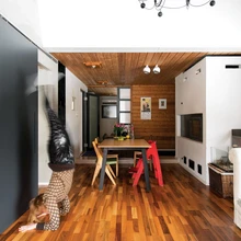Kui ümberehitus algas, oli Liis äsja lõpetanud töö sisearhitektuuribüroos, mille käekirjaks olid mustvalged interjöörid ja mitu aastat selles võtmes mõtlemist lõppes plaaniga värvida ka oma kodus kõik pinnad valgeks. Ühel hetkel said otsa nii valge värv kui ka viitsimine ja selleks ajaks, kui suure maalritööga edasi oleks võinud tegeleda, ei suutnud nad ise ka enam hästi uskuda, et nad tõesti midagi nii lakoonilist ja tavalist olid kavandanud. Köögi jõudsid nad küll valmis saada, kuid sinna on järgnevatel aastatel lisandunud nii palju kunsti, keraamikat ja raamatuid, et see ei mõju kaugeltki mitte mustvalgena.