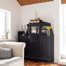Hoopis teise kaalukategooria ja ajastu tegelane on aga elutoa nurgas seisev puhvetkapp ja sellega seoses kõlab esimest korda ka Karl-Eriku vanaema, Eesti sisearhitektuuri grand old lady Leila Pärtelpoja nimi. Leilaga seotud või tema tehtud esemeid on Tarbete kodus veelgi, näiteks osad toolid söögilaua taga – laua autor on Karl-Erik. Kaunis, lapsemeelselt rõõmus ja reeglitevaba keraamika nii sellele laual kui ka kõikjal mujal Karl-Eriku ja Liisi kodus on aga Kristine Pärtelpoja looming.