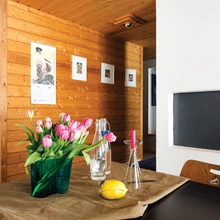 Kuna majas oli varem siserõdu ja elutoa lagi oligi väga kõrge, siis ehitati rõdu kinni kaldseinaga ja seda kõrgust säilitada püüdes. Maja tegelikule ehitusaastale ei vihja siin enam miski peale Estoplasti valgusti, mille Karl-Erik ja Liis pisut ümber disainisid. Nimelt kadus kõrges ruumis valgus lakke ära, lisatud kettad peegeldavad selle ruumi tagasi ning ka nelja pirniga annab see nüüd ruumi kordi rohkem valgust kui varem täistuledes.