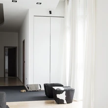 Päris ilma musta värvita pole saadud ka siinses korteris: kahes magamistoas jäävad silma ekstravagantsed tumedad kardinad. «Lähenesime magamistoa tekstiilidele üsna julgelt, musta värvi kardinaid ei juleta just tihti kasutada,» märgib Mari Koger. Mustad linased kardinad näevad kõrgete akende ees igal juhul kenad välja ja panevad muidu minimalistlikud ning lakoonilised toad elama. Eraldiseisvat mööblit pole ruumides palju, garderoobid on lahendatud sisseehitatud kappidena, mis sulanduvad seintega maitsekalt üheks. Kõik garderoobid ja uksed on valminud firmas Kalla Mööbel. Korteri kujundus haakub ideega moodsast ja mugavast linnakodust. Siin on rõhku pandud väljapeetult rahulikule esteetikale, valgusele ja avarusele.