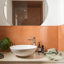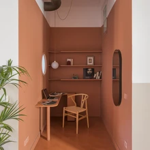 Kõige silmatorkavama värviploki moodustab terrakotatoonis köögiala – siin on savikarva nii seinad, allatoodud lagi, mis varjab lisatud tugitala, kui ka köögimööbel. Halvas seisukorras olnud põrandaplaadid kaeti samuti terrakotakarva mikrotsemendiga; sama toon jätkub ka köögi vastas olevas seinaorvas, kuhu endise söögitoanurga asemele kavandati väike kodukontor.