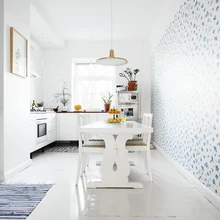 Korteris on 80 ruutmeetrit: kaks magamistuba, elutuba, köök ja vannituba. Kõike ühendab selgroona pikk koridor. «Otsustasime planeeringu suures osas samaks jätta. Fakt, et köök ja elutuba on eraldi ruumid, tundus nagu kingitus, sest moodne avatud köögi ja elutoaga lahendus oli meil juba olnud ja sellel on siiski teatud miinused,» räägib Jan. Erinevalt eelmisest kodust taheti ruumi rohkem valgust tuua. Kõik seinad ja laed värviti põhiosas valgeks. Hiljem lisatud põrandakihtide alt tuli välja vana laudpõrand, mis samuti valge värviga kaeti – nii peegeldub akendest põrandale langev valgus edasi ruumi ja efekt on kordades suurem.