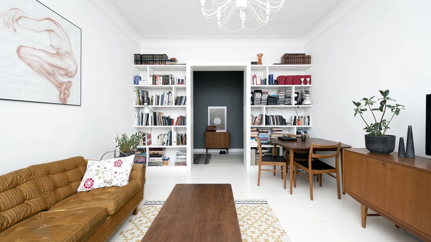 Suur raamaturiiul elutoas on arhitektist pereisa enda kätega valmistatud. | foto: Terje UgandiStalini-aegse maja sisemuses ootab ees avar, kõrgete lagedega valgusküllane kodu. Sõbrad, kes külla satuvad, ütlevad «Pariis!», «Lissabon!», «Berliin!», iseloomustamaks selle kodu atmosfääri. Nii ongi, sest just nende paikade kodud on pererahvast inspireerinud. Kui korteri omanikud soovivad aga nautida tõelist miljonivaadet, avaneb aknast kogu Toompea arhitektuur oma ilus, eriti kaunis on see vaade talveõhtutel, kui linn tuledes särab.