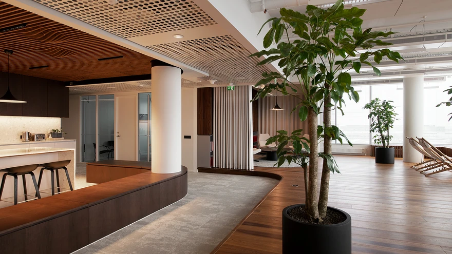 Kööginurgaga saalis innustavad töötajaid nii hunnitud vaated kui ka paar korda nädalas toimuvad ühised joogatunnid. | foto: Terje UgandiÜlemiste ärilinnakus on valminud stiilne ja puidulõhnaline uustulnuk.