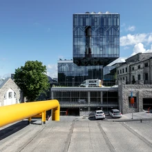 Sisenedes hakkab silma kohe parklakorrus, mida piiravad lihtsalt võrratud uduvihma meenutavad klaaslamellid. Peasissepääsu kohal eendub konsoolina neli ülemist korrust, mis päädivad katuseterrassiga. Omamoodi ehitusaineseks paistavad olevat pilved, mis mööda seinapindu tuulte tahtmisi mööda seilavad. Hoone ees on kargelt kivine – osaliselt klaasist, osaliselt sepispiirdega – lõunasse avanev väljak, mida meedia kasutab sarnaselt terassidega usinalt televõtete tegemiseks, ning mille meeleolu jätkab sisehoov. «Kui sa tuled siia, näed mitmekesist ümbrust ja tekib ajastute kihiline ruum,» iseloomustab Aule eritabast olustikku.