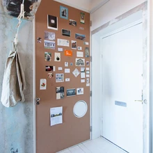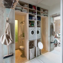 Korterisse sisenedes jäävad vasakut kätt esikunagid, paremat kätt on tualett koos duširuumiga. Esiku poolt on WC-uks kaetud korkplaadiga, mida saab kasutada infotahvlina. Sinna on hea kinnitada sedeleid, kaarte ja fotosid. Ukse sisekülg on aga peeglist – ust esiku poolt avades tekib ruumi põrandast laeni peegel. Standardmõõtudest palju laiem ja kõrgem WC-uks peidab enda taga ka pesumasinat ning praktilist panipaika. Karin säilitas remondi käigus algupärase siseakna vanni- ja elutoa vahel. Selle kaudu pääseb praegusesse duširuumi loomulik valgus, mis mõjub põneva ruuminüansina.