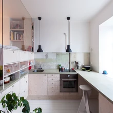 Köök asub otse magamistsooni kõrval, olles viimasest eraldatud klaasseinaga. Magamislavatsi raami on kavandatud köögi poole avanevad praktilised sahtlid. Traditsioonilisi seinakappe köögis ei ole. Köök on värvitud üleni valgeks, et see peegeldaks maksimaalselt valgust. Akna all jookseb tööpind ehk lett, mille taga einestades võib aknast avanevat vaadet nautida.
