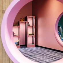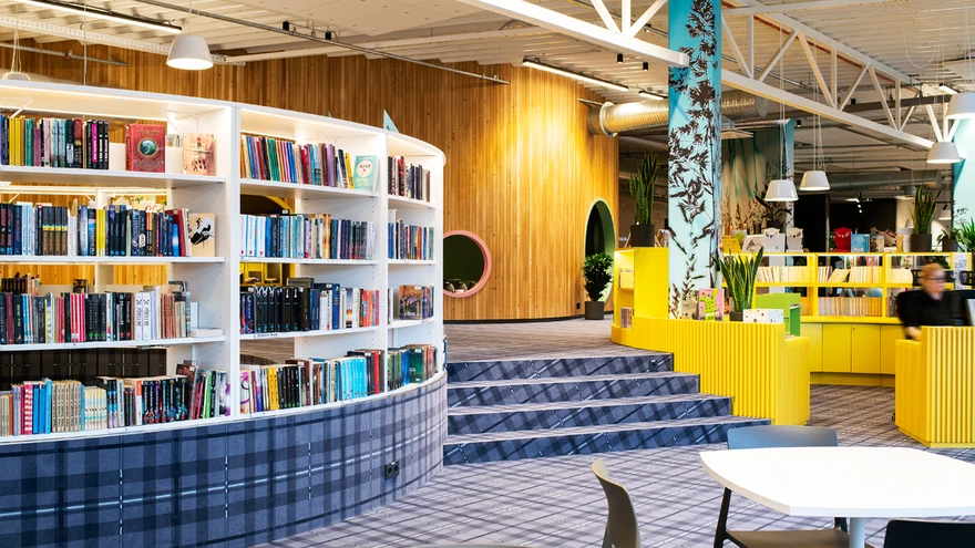 Nõnda rõhutati ka disainiga, et siin on elav kohtumispaik. Sestap lasti näiteks ehitada keset ruumi suhtlust ergutav isteastmestik, kus saab korraldada suuremaid või väiksemaid arutelusid. Tõeline kogukonnakeskus! Õnneks on siiski neile, kes tahavad omaette lugeda või tööd teha, eraldatud kuubikuid ja majakesi meenutavaid tugitoole. Lastel on olukord veel parem – neile on tehtud lesimisalasid, mängunurki (on ka lelusid, leiab näiteks Pipi, Lotte ja Muumitrollid), aga ka justkui urgu meenutav eraldumispaik, kuhu tuleb aukude kaudu sisse pugeda.