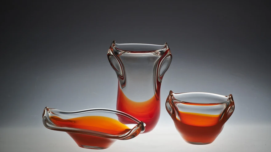 Alus ja vaasid Gondel. | foto: ETDMTarbeklaasil on olnud Eesti klaasi- ja disainiajaloos keskne ning mõjukas roll mitme kümnendi vältel. Praeguseks teab ilmselt enamik eestlasi oma kodustel riiulitel asuvate esemete autorit ja võimalikku hinda. Üks olulisemaid nende seas oli Pilvi Ojamaa (1930).