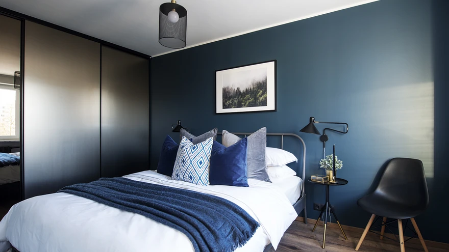 Köögi hall toon kordub pisut erinevas varjundis elutoa seinal ja muutub magamistoas sumedaks sinakasroheliseks paletiks. Nüansirikas seinatoon muudab pisikese magamistoa põnevaks ja külluslikuks, ka messingutooni aksessuaarid sobivad tervikusse suurepäraselt. «Messing on interjöörimoes praegu väga armastatud,» märgib aastaid Londonis elanud kujundaja. «Samuti soojad samblarohelised ja sügavsinised värvitoonid.»
