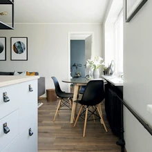 Põhjamaiselt harjumuspärase valge asemel on Karolina julgenud nappidele ruutmeetritele tuua tumedama värvigamma. Tulemus räägib iseenda eest ja annab tunnistust, et väikestes ruumides ei maksa tumedaid toone karta, iseäranis siis, kui korteris on suured aknad ja palju loomulikku valgust. Selles tillukeses korteris tagavad kvaliteetne viimistlus, õdus värvivalik ja toredad sisustusdetailid visuaalse ühtsuse ning hubase olemise