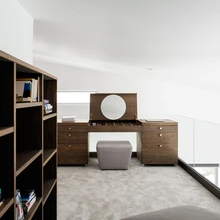 Et kompaktses elamises ühtset läbivat joont hoida, vahetati ära nii sise- kui ka välisuksed. Esimesed telliti Haapsalu uksetehasest, kõik tammepuidust pinnad ja esemed – põrand, mööbel ja uksed – viimistleti ühtlaselt Finefloorsi õlivahaga. Renoveerimisega jõuti ka teisele korrusele, kus sisustati mitmefunktsiooniline ruum lugemiseks, töötamiseks või isegi sportimiseks. Jalge all mõnusalt pehme vaipkattega ruumis püüab eelkõige pilku eritellimusel valmistatud puidust töölaud, mille kaas avaneb rohkete sahtlitega kosmeetikalauaks.