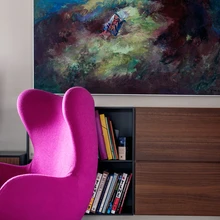 Elutuba ning privaatsemat magamistoa- ja kabinetiosa tsoneerib ruumijagajana suur raamaturiiul. Seinariiulid ei tulnud kõne allagi, kuna seinad tuli hoida kunsti päralt. Magamistuba ja kabinet on oma tumedas tonaalsuses esinduslikud ning soliidsed. Kui esimesse annab pehmust voodi peatsis olev tekstiiltapeet, siis kabinet mõjub igati asjalikult ja väljapeetult. Ootamatu värvilaigu toob ruumi fuksiaroosa Arne Jacobseni tugitool Egg (Muna), hubasust lisavad peremehe valitud siidivaibad. Suurimad pilgupüüdjad, mis interjööris rõhutatult elama hakkavad, on maalikunstnik Lola Liivati jõuliste värvidega abstraktsioonid. Uhke kollektsioon on kogunenud kunstisõbrast peremehe koju aastate jooksul ja nii mõnigi töö rändab erakogust aeg-ajalt näitusesaalidesse.