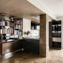 Soliidselt ja mehelikult mõjub tume spoonitud erimööbel, mille kavandamisel oli abiks disainer Peter Sampson (Peter Sampson Design OÜ, salong Vivid). Rahuliku spooni kõrvale toob särtsu osal sahtli- ja kapiustel kasutatud art déco’lik muster. Tegemist on õhukese dekoratiivse materjaliga Sibu, mida saab hõlpsalt spoonile kleepida. Köögikappidel on seevastu kombineeritud lakoonilist matti ja läikivat tumehalli klaasi. Sisekujundaja on pööranud palju tähelepanu väikestele detailidele. Põrandatel on võimalikult märkamatu liist ja korteri kaks siseust on Eesti tootja Ego sarjast Invisible (Nähtamatu). Magamistoas ja kabinetis eemaldati plastist aknalauad ning aknad viimistleti metallservaga; päikesevalguse eest pakuvad varju bambusest puitribikardinad. Igasse ruumi on paigaldatud kvaliteetne Bose helisüsteem.