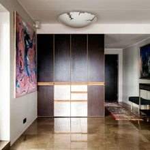 Teadliku maitse ja konkreetsete soovidega peremees rääkis kujundusotsustes igas mõttes kaasa. Kuna korteris elab ka pikakarvaline pärsia kass nimega Boko Haram, hüüdnimega Terrorist, tahtis mees kindlasti kivipõrandat, mida on lihtne hooldada. Interjööri valitigi paekivitooni, kuid marmoriimitatsiooniga kivipõrand, mille läiklev mustrimäng on ruumis jõuline kujunduselement.