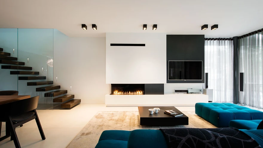 Valdavalt on valgustid tagasihoidlikud, kuid ruumi aktsent on efektne rippvalgusti söögilaua kohal ja põrandavalgustid. Üldiselt on rõhku pandud pigem heale valgusele ja valgustusele. Majas on gaasikamin. Sisearhitektide sõnul eelistatakse neid aina rohkem, sest gaasikamina elav tuli on sama lummav, aga hooldamine lihtsam.