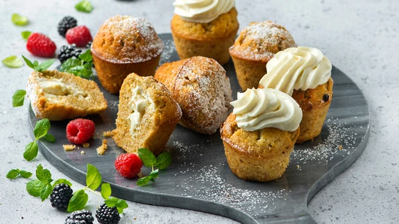 Suvikõrvits annab muffinitele mahlasuse, aga küpsetiste seest leiab ka toorjuustu. Serveerimisel võib muffinid katta toorjuustukreemiga....