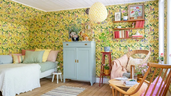 Astudes Emma ja Hanna aiamajja, tekib iseenesest hea tuju. Majake on rõõmsa erkkollase tooni saanud ja võluvalt kujundatud teise ringi mööbliga. Tõeline pilgupüüdja on aga magamistoa seintel olev tape...